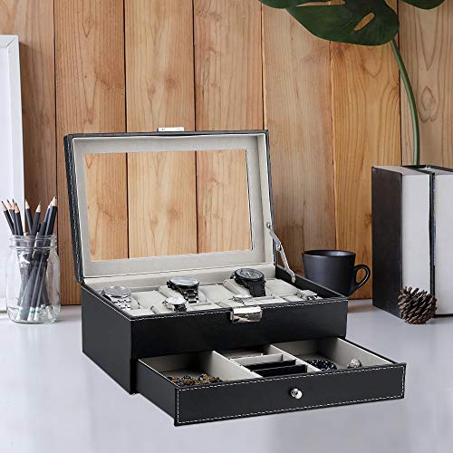 DISPLAY & STORAGE: This 12 slots double-layer watch display box is a wonderful item allowing a gentleman or lady to display his or her entire collection of chronometers, tastefully protects, stores, organizes 12 watches in the first layer. The under layer offers individual compartments for rings, earrings, bracelets, necklaces, brooches and sun glass to your daily needs perfectly.