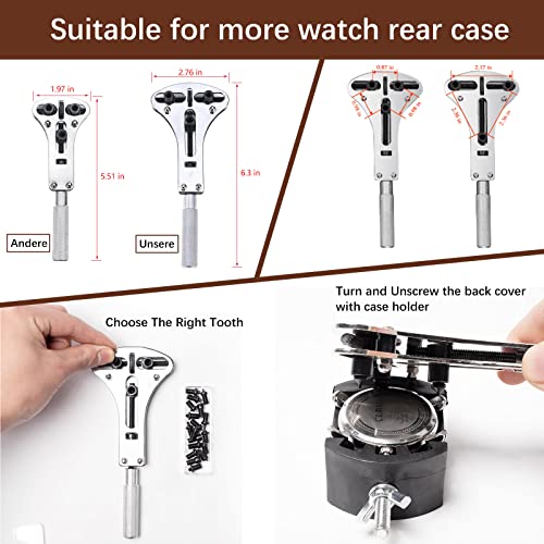 【More comprehensive tools】This professional watch repair tool kit adds watch remover accessories, spring rod ear accessories and more punches and watch opening clips, more options and perfect for fixing common watch faults, the new watch opening clips allow you to easily open the back cover of most watches, with an adjustment range of 20mm-55mm, this watch tool kit is convenient for you to complete your watch repair work at home anytime.