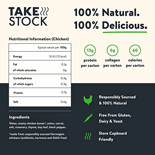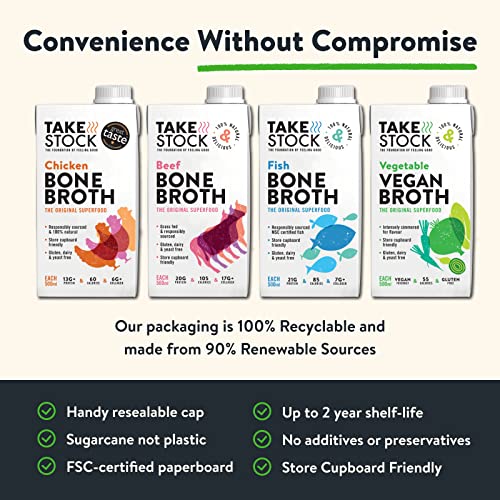 CONVENIENCE WITHOUT COMPROMISE: Take Stock Bone Broth is a store-cupboard essential (up to 24 month shelf life) packed in handy 500ml resealable cartons. Simmered for hours, ready in seconds!