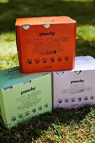MIXED CASE – At Punchy we make delicious, low calorie soft drinks. This mixed case contains x 6 cans of each flavour including: Golden Hour — BLOOD ORANGE with Bitters & Cardamom; Holiday Romance — PEACH with Ginger & Chai; and First Dip — CUCUMBER with Yuzu & Rosemary.