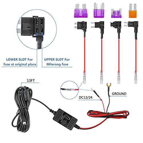 ✅{Broadly Compatibility}✅ : Input:12V-24V; Output:5V/2A (also fits for 1A). Coming with both Mini and Micro USB ports, The dash cam hardwire kit compatible with all of dash cams Car DVR, GPS Navigator, Radar Detectors and More. Also comes with Low-Profile Mini, Mini, ATO (Regular) and Micro2 fuse adapter, suitable for most cars. Leads come with protective sleeve to cover the crimps