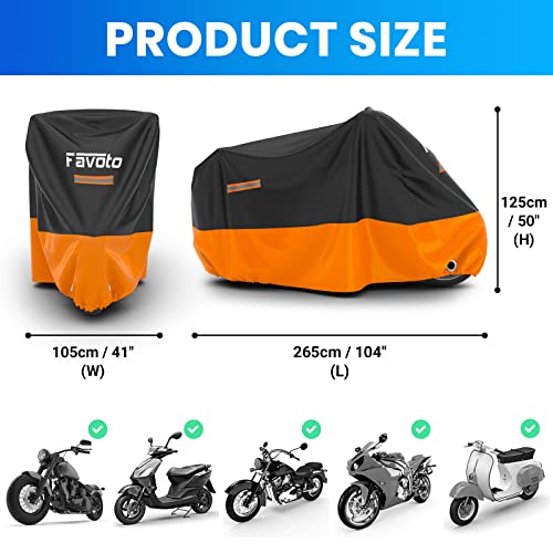 【Universal Fit】- Favoto motorcycle cover is universal and fits various motorcycles. Fits up to 104″ in length motorcycles.