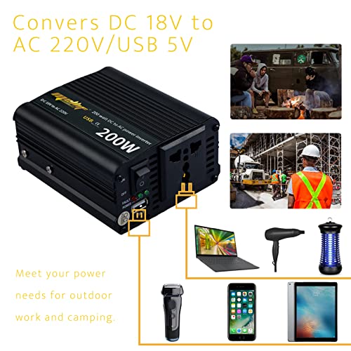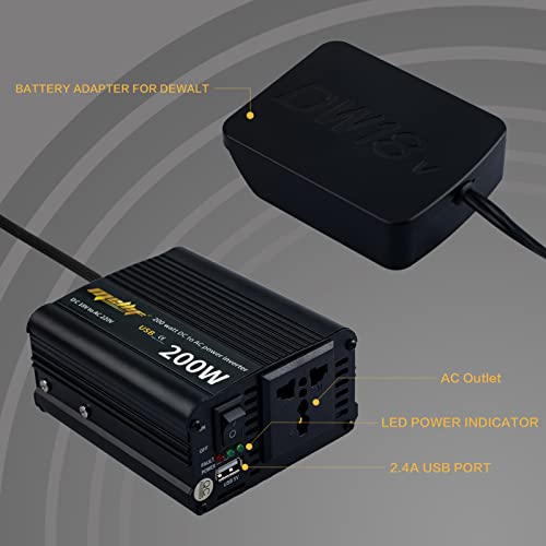 200W Battery Generator Compatible with Dewalt 18v 20v max Lithium-ion Battery. Input: DC 14.4V-21V Output: 1* USB 5V/2.4A AC 220V, 1* AC Outlet, Max 200W Continously power supply