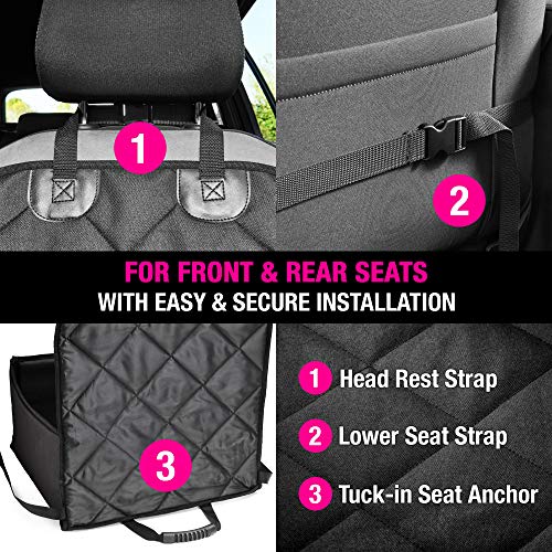 FOR FRONT & REAR SEATS: Installation is very easy – clip the top adjustable strap around the headrest, the lower adjustable strap around the back of the seat and then tuck-in the secure seat anchor for additional security.
