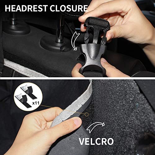FAST AND STABLE INSTALLATION – 11 hook and loop straps and 2 click closures on the headrests for a stable attachment. The trunk protection can be easily installed and removed within a minute.