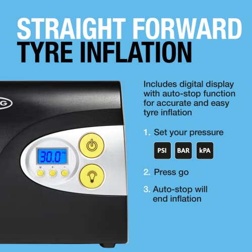 Specification: Ring Automotive RAC601 Digital Tyre Inflator with Auto Stop and LED Light For cars, motorbikes, inflatables and more