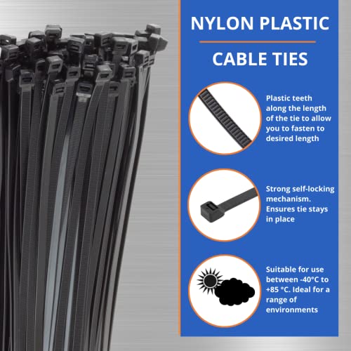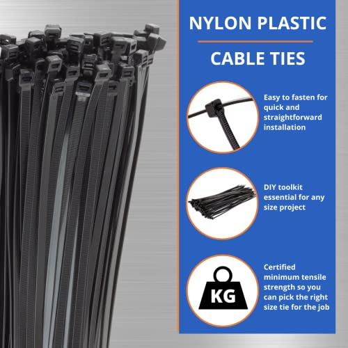 PACK OF 100 MULTI PURPOSE NYLON CABLE TIES: 300mm x 3.6mm black plastic cable ties. Made from durable and UV-resistant nylon polyamide 6/6 for a long-lasting solution for DIY or professional use. Wide range of colours, lengths, and widths available to find the perfect product for the job.