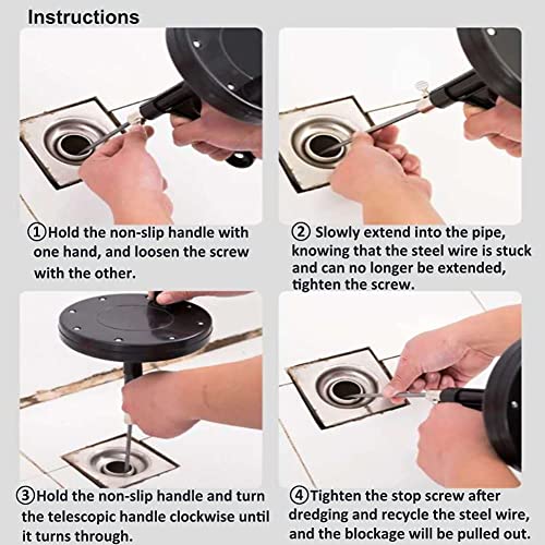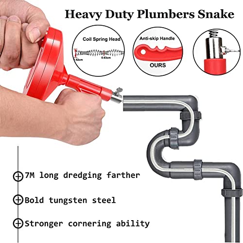 [7.7M Heavy Duty Drain Unblocker]:This professional drains snake Unblocker tool is equipped with a durable spring steel cable of about 7.62 meters long, Special structures of cleaner make it easy to pull out hair and other dirt that can clogging the drain including Toilet and Kitchen sinks, bathroom, showers, and drainage pipes. Instead of calling a plumber and a getting a big bill, unclog the drain yourself!