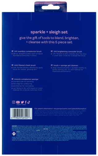 Sparkle + Sleigh Makeup Brush & Sponge Set includes: (1) RT 241 seamless complexion brush, (1) RT 242 brightening concealer brush, (1) RT 444 filtered cheek brush, (1) Miracle Complexion Sponge, and (1) 1 oz brush and sponge gel cleanser