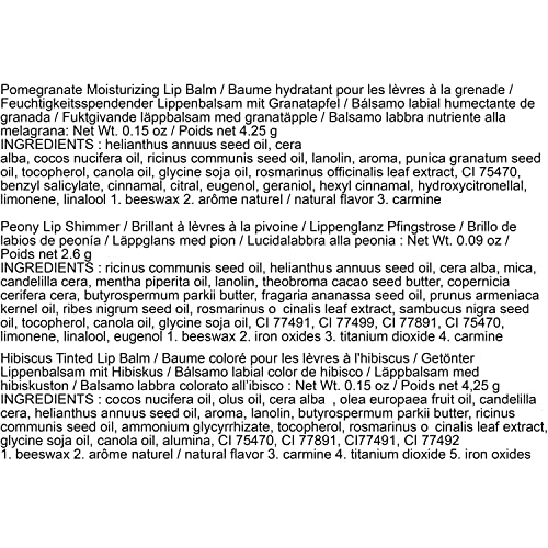 Hibiscus Tinted Lip Balm: cocos nucifera (coconut) oil, olus [vegetable] oil, cera alba [beeswax], olea europaea (olive) fruit oil, candelilla cera [euphorbia cerifera (candelilla) wax], helianthus annuus (sunflower) seed oil, aroma [flavour]*, lanolin, butyrospermum parkii (shea) butter, ricinus communis (castor) seed oil, ammonium glycyrrhizate, tocopherol, rosmarinus officinalis (rosemary) leaf extract, glycine soja (soybean) oil, canola oil, alumina. May Contain : CI 77491•77492•77499 [iron oxides], CI 77891 [titanium dioxide], CI 75470 [carmine] *arôme naturel / natural flavour Pomegranate moisturising Lip Balm: helianthus annuus (sunflower) seed oil, cera alba (beeswax, cire d’abeille), cocos nucifera (coconut) oil, ricinus communis (castor) seed oil, lanolin, aroma (flavour)*, punica granatum (pomegranate) seed oil, tocopherol, rosmarinus officinalis (rosemary) leaf extract, glycine soja (soybean) oil, canola oil (huile de colza), carmine, benzyl salicylate, cinnamal, citral, eugenol, geraniol, hydroxycitronellal, limonene, linalool *natural flavour Peony Lip Shimmer:ricinus communis (castor) seed oil, helianthus annuus (sunflower) seed oil, cera alba [beeswax], mica, candelilla cera [euphorbia cerifera (candelilla) wax], mentha piperita (peppermint) oil, lanolin, CI 77891 [titanium dioxide], theobroma cacao (cocoa) seed butter, copernicia cerifera (carnauba) wax, CI 77491 [iron oxide], butyrospermum parkii (shea) butter, fragaria ananassa (strawberry) seed oil, prunus armeniaca (apricot) kernel oil, ribes nigrum (black currant) seed oil, rosmarinus officinalis (rosemary) leaf extract, sambucus nigra seed oil, tocopherol, canola oil, glycine soja (soybean) oil, CI 75470 [carmine], CI 77499 [iron oxide], eugenol, limonene, linalool