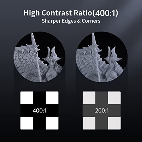 【4K High Resolution & Higher Accuracy】This newly high resolution 3840×2400 MONO 4K resin printer has smaller pixel and sawtooth texture, to print more delicate and smooth surface; In addition, the contrast ratio is more than 400, making printing details more accurate and delicate, thus improving the printing quality and success rate