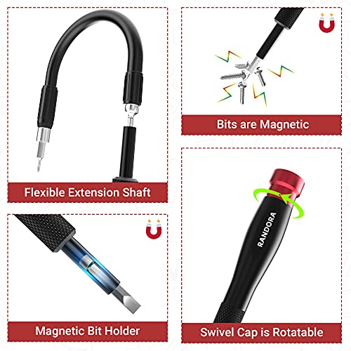 ✅66-in-1 screwdriver set – The Randora high precision screwdriver set includes 63 screwdriver bits (4mm), a screwdriver featuring a non-slip handle and rotational/swivel cap for easy use and control over tiny screws. Our set also includes A flexible extension Shaft to get to hard to reach areas,powerful magnetic pickup bit for easy locating and pickup screws or bits that are lost or in hard to reach areas and a sorting tray.