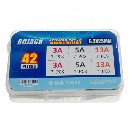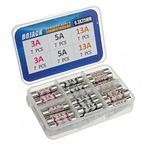 Specification: BOJACK 3 Values 42 pcs 3 5 13 A amp 240 V Volt Household Mains Plug Fuse 6.3×25 mm 0.25x1Inch BS1362 Ceramic Tube…