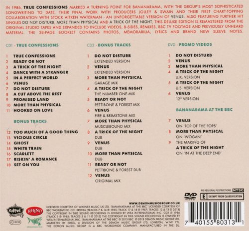 In 1986, “True Confessions” marked a turning point for Bananarama, with the group’s most sophisticated songwriting to date, their final work with producers Jolley & Swain and their first chart-topping collaboration with Stock Aitken Waterman – an unforgettable version of “Venus”. Also featured are further hit singles “Do Not Disturb”, “More Than Physical” and “A Trick Of The Night”. Remastered from the original studio tapes, this Deluxe 2 CD + DVD casebound book edition, expertly compiled and annotated by acknowledged expert Tom Parker, features nineteen bonus tracks! Aside from the non-album B-sides, and the many mixes, are four previously unreleased tracks: two previously unreleased songs (“Too Much Of A Good Thing” and “Vicious Circle”) and two previously unreleased Shep Pettibone mixes. Recorded with Daryl Hall, “Riskin’ A Romance” was originally exclusive to the soundtrack of the film “The Secret Of My Success” The DVD features six promo videos, as well as two BBC TV appearances and a documentary about making the UK video for ‘A Trick Of The Night’, all on DVD for the first time ever. The 28-page book contains photos and memorabilia, lyrics and brand new sleeve notes.