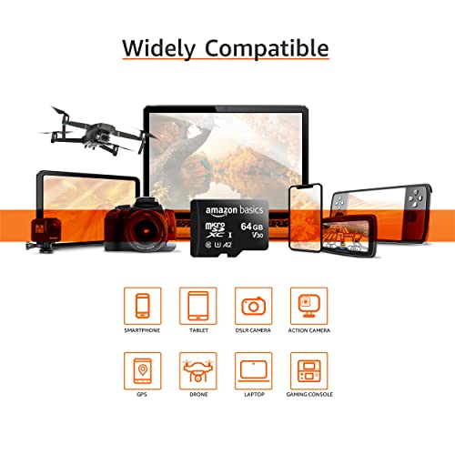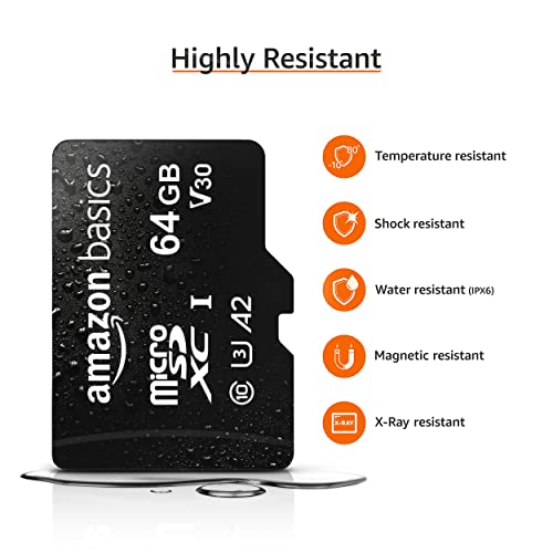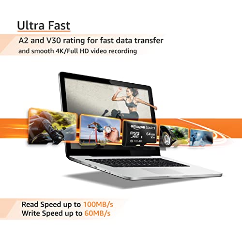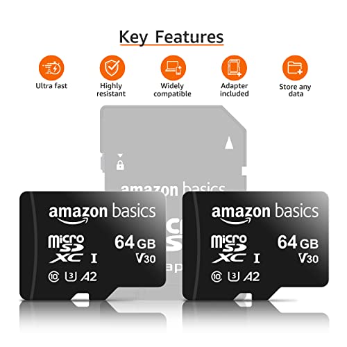 Amazon Basics – MicroSDXC, 64 GB, with SD Adapter, A2, U3, Read Speed up to 100 MB/s, 2-Pack