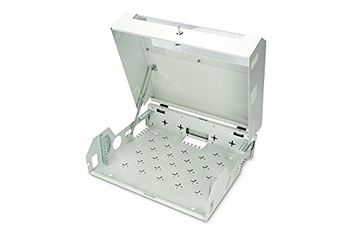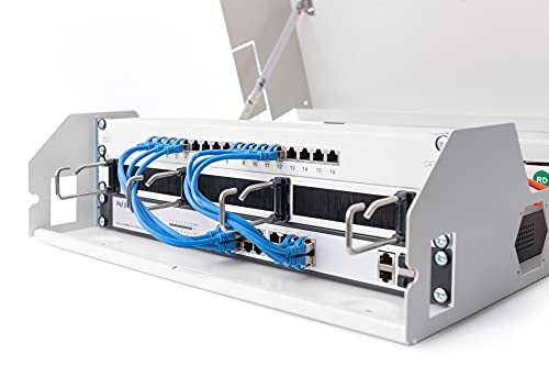 The Wall Mounting Cabinets SoHo, Slim are perfect for the placing of active and passive components. They are characterized by an easy and time saving installation. The modern design suits to every office or home environment. There are two separate installation possibilities: The front side is equipped with a rotatable vertical 3U rail. Alternatively, it can be positioned horizontally or even angled. On the rear side there is a 2U rail (fixed), which can be used for passive network components for example. Due to punched out mounting holes in the lower housing area also non rack mountable equipment can be installed (e.g. DSL router, etc.). Alternatively you can install a device mounting plate which is available seperately.