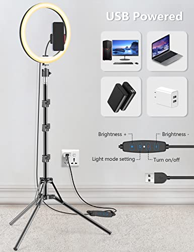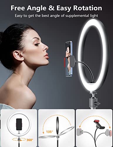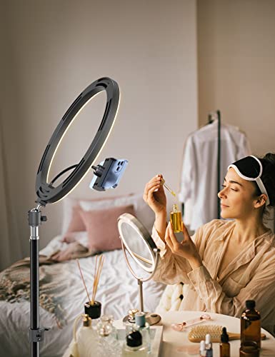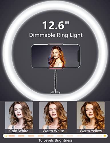 12.6” Dimmable Ring Light: Adopt special LED SMD design and curved light cover, the light is more uniform and softer, take away all the unflattering shadows makes your selfie more charming. The large ring light provides better fill light and is a professional tool for creating videos, live streaming, making up or taking selfie pictures. 3 light mode: white, natural, and warm light, and each mode has 10 levels brightness (color temperature: 3000K-6500K).
