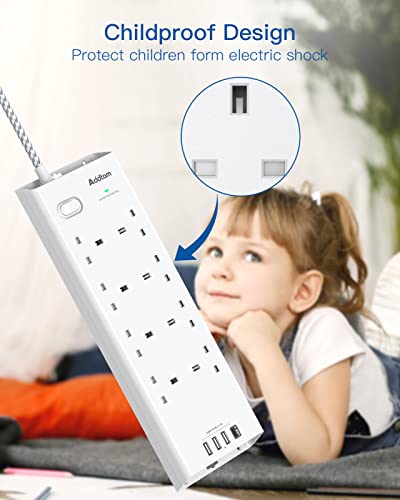 【Childproof Design & Upgraded Braided Extension Cord】 Child-protective safety door keep children safe from electric shock of careless touching. The 1.8 Meters long extension cord is made of pure copper, which is very thick and has better current carrying capacity (13A). The braided power cord is not easy to deform, durable and more safety.