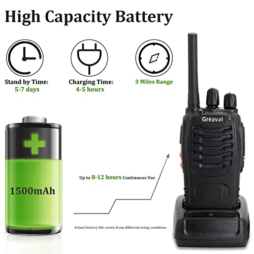 High-capacity Battery: 1500 mAh rechargeable battery, supports up to 12 hours of continuous use, each walkie-talkie has a charging base.