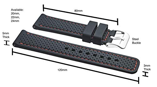 This soft & smooth stitched silicone sporty watch band is a perfect combination of comfort, flexibility and durability. This band will not easily crack, smell or get harder in any rough sports or other activity. This premium quality silicone watch band has soft and smooth finish. It is waterproof and Hypo-Allergenic. Additional Information: Our Silicone Bands are manufactured with superior grade Silicone with high tensile and strength and can endure any extreme environment and will not easily deform or crack. They are extremely soft and comfortable. They have plenty of holes available to adjust the length and fit wrist.