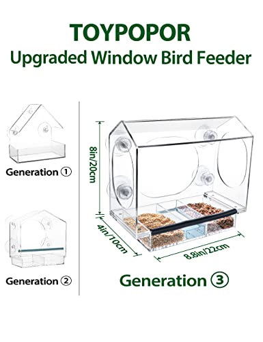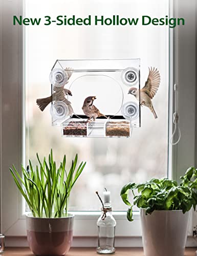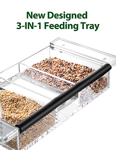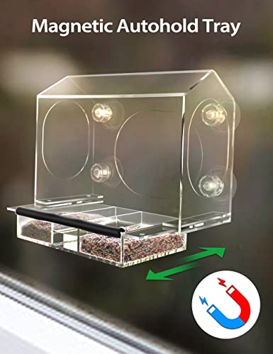 Acrylic Window Bird Feeder with 4 Strongest Screw Suction Cups, Equipped Magnetic Sliding Feeding Tray with Drain Holes…