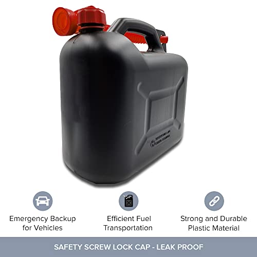 Features integrated – carrying handle, safety screw lock cap – leak proof. Comes with easy-to-use flexible spout. The spout will only work when pushed in, so no liquid will pour until you are ready for it to do so. Unique wide channel for better, smoother pouring. Provides safe pouring and no leakage whilst filling fuel in your vehicle