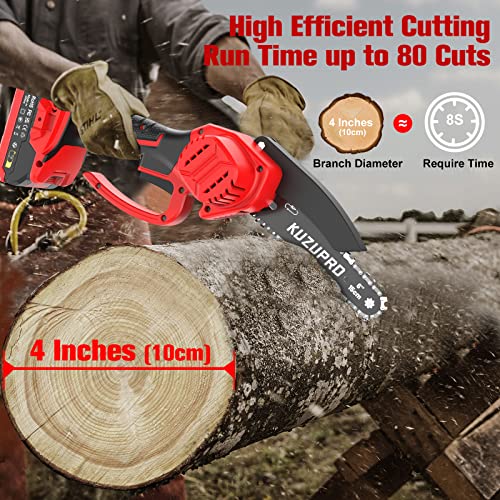 【Upgraded Brushless Motor】 KUZUPRO Mini Chainsaw has a powerful brushless motor inside, which increases lifespan by 90%, output power by 80%, and reduces energy consumption by 50%, giving your cutting work with no jam, low noise and high efficiency. With 10m/s of chain speed and 6 inch guide bar, it only takes about 8 seconds to cut logs with diameter of approx 4 Inch, just like cutting butter!