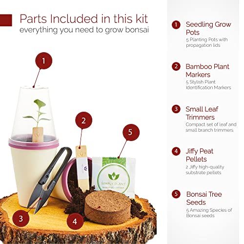 EVERYTHING YOU NEED TO GROW YOUR OWN BONSAI TREE – Having the right tools for the job is critical when embarking on any new task, and with the Simply Plant Grow your own Bonsai Kit you certainly have just that. Each kit contains 5 varieties of Bonsai tree seeds, 2 large nutrient rich Jiffy peat discs, 5 auto Irrigation plant pots, 5 plant markers, a set of leaf pruners, a 32-page information and instruction booklet and a 46-page downloadable eBook.