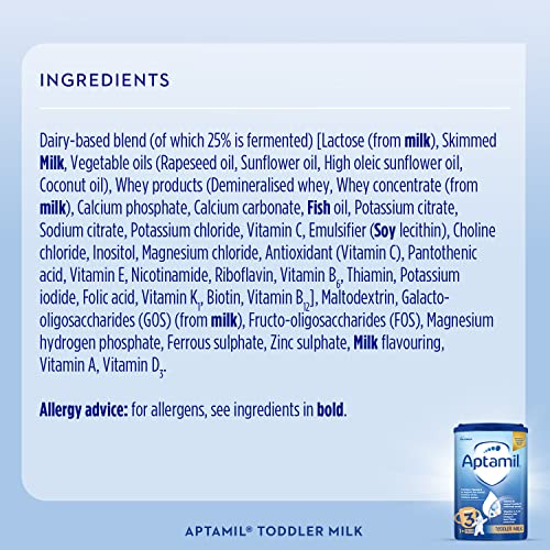 Dairy-Based Blend (of which 25% is Fermented) [Lactose (from MILK), Skimmed MILK, Vegetable Oils (Rapeseed Oil, Sunflower Oil, High Oleic Sunflower Oil, Coconut Oil), Whey Products (Demineralised Whey, Whey Concentrate) (from MILK), Calcium Phosphate, Calcium Carbonate, FISH Oil, Potassium Citrate, Sodium Citrate, Potassium Chloride, Vitamin C, Emulsifier (SOY Lecithin), Choline Chloride, Inositol, Magnesium Chloride, Antioxidant (Vitamin C), Pantothenic Acid, Vitamin E, Nicotinamide, Riboflavin, Vitamin B₆, Thiamin, Potassium Iodide, Folic Acid, Vitamin K₁, Biotin, Vitamin B₁₂], Maltodextrin, Galacto-Oligosaccharides (GOS) (from MILK), Fructo-Oligosaccharides (FOS), Magnesium Hydrogen Phosphate, Ferrous Sulphate, Zinc Sulphate, MILK Flavouring, Vitamin A, Vitamin D₃