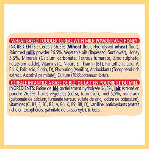 Wheat flour, milk skimmed solids, sucrose, honey, palm olein, low erucic acid rapeseed oil, coconut oil, sunflower oil, maltodextrin, vanillin, bifidus culture, minerlas & vitamins.