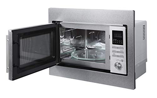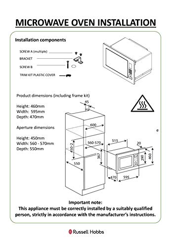 This 25 litre built in combination microwave from Russell Hobbs will fit Beautifully into your kitchen, integrating well amongst your existing appliances and units. It combines microwave cooking with grill power and convection oven enabling you to cook a variety of dishes with just one appliance. cooking meals for family and friends or reheating large plates of food becomes simple and easy with 900 watts of microwave power and 10 auto cook menus. this microwave has a 31.5cm wide removable glass turntable and a Stainless Steel interior for easy cleaning. It also has weight and time Defrost settings a child safety lock and a simple, functional control panel, including clock and digital timer. It comes complete with a grill rack and baking tray, giving everything you need to use every function of this combination microwave. product Dimensions (CMs): (h)46.0 x (W)59.5 x (d)47.0 aperture Dimensions (CMs): (h)45.0 x (W)56.0 x (d)55.0