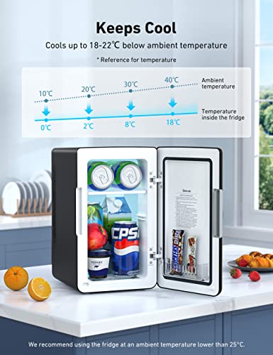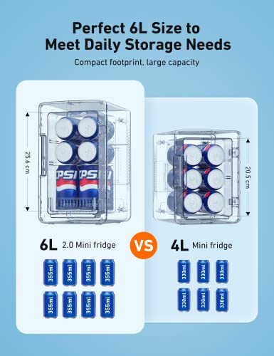 Convenient 6L Capacity: Its internal dimensions are 13*14*25cm. With the included shelf, it can store up to 8*330ml cans. With the shelf removed, it stores up to 8*355ml cans or 4*550ml water bottles. Use the mini fridge to handily store and cool small items like makeup, skincare products, snacks and more.