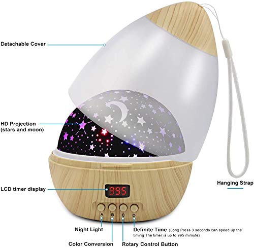 ✔Simple to operate:To operate this light, just press the on/off button, which will then light up the timer display, press button D for the desired timer in minutes, this can go up to 995 minutes with increments of 5. Once you have selected the timer, pressing button B will activate the colours, continued pressing will take you through the range of available colours with a flashing mode at the end. If you just want the white light then press button A. To move the star projection press button C.