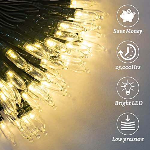 Warm White Christmas Tree Lights: This Christmas lights on green wire include 2 pack 50 transparent LED bulb, 16 feet green wires (same color with the tree). It emits a warm soft light and brings a comfortable festive atmosphere.