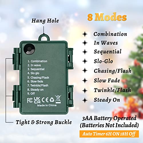 Twinkle Christmas Lights: 8 Lighting Modes to meet your various needs, Combination/In waves/sequential/slo-glo/chasing/slow fade/ twinkle/steady on. 6h on and 18h off auto timer to save your energy bill.