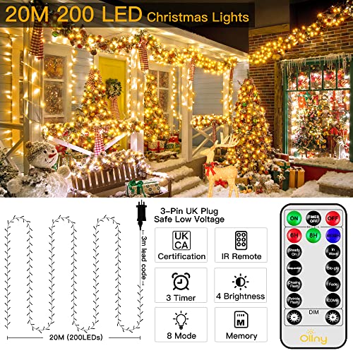 Ollny Christmas Tree Lights Outdoor – 20m 200 LED Fairy Lights Plug in Waterproof Outside Warm White String Lights 8…