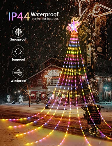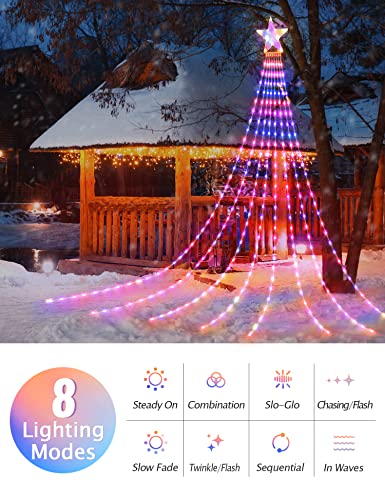 ⭐【Easy to install】The Christmas light comes with a 16.4 ft power cord, which is not only easy to install; but also can be used for indoor or outdoor decoration; When you install it, just hang the topper star on the Christmas tree, outdoor tree, the exterior wall, window, or eaves, and 8 strands of light will fall to the ground; It also comes with 8 PCS metal stakes, you can use them to fix 8 strands of light