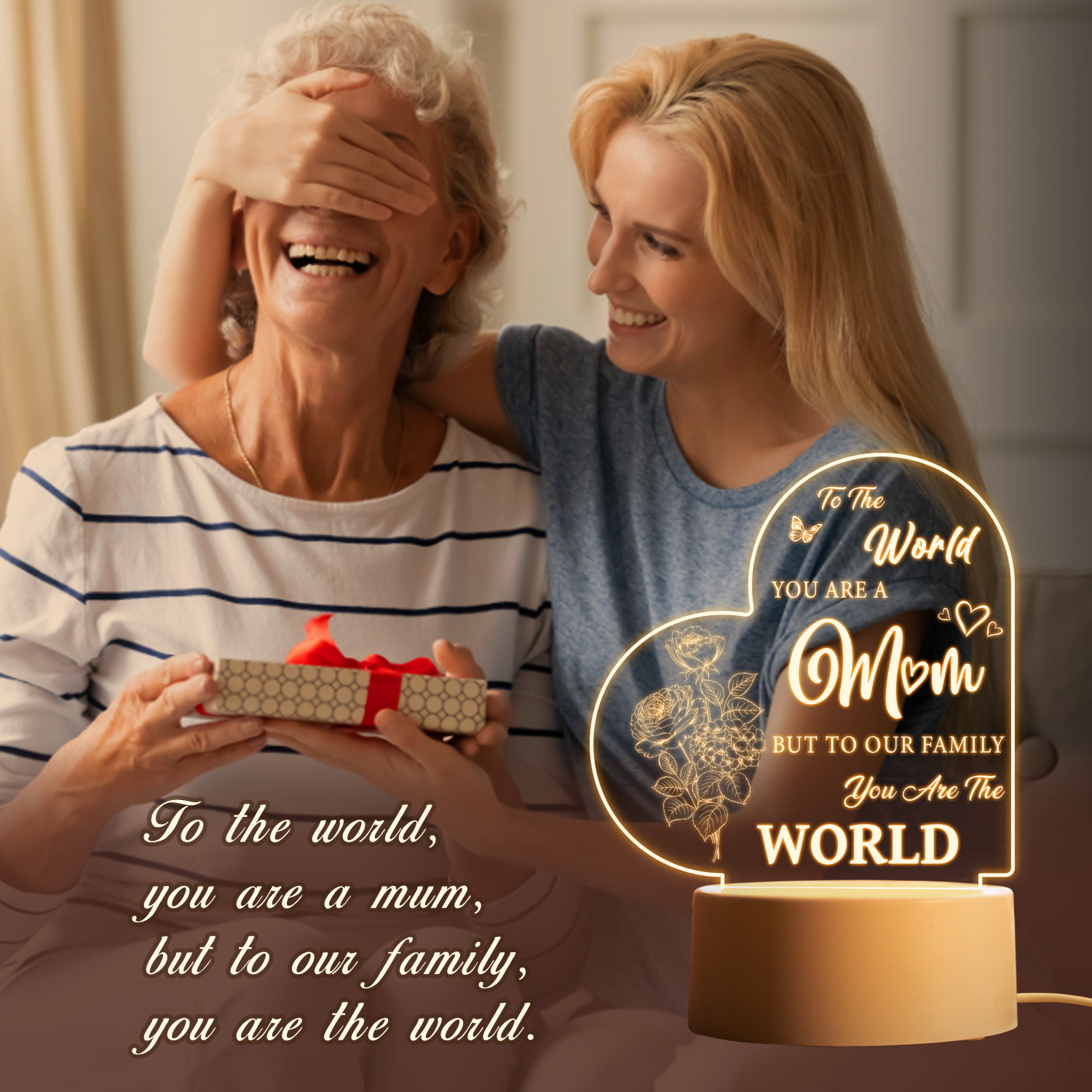 【Mum Gifts from Daughter/Son】Are you looking for a unique and sweet gift for mum? Our acrylic night light is the first choice for creative and meaningful presents for mum. Engraved with a sentimental saying “To the world you are a mum, but to our family you are the world”, it’s a special way to express your love to your dear mum.