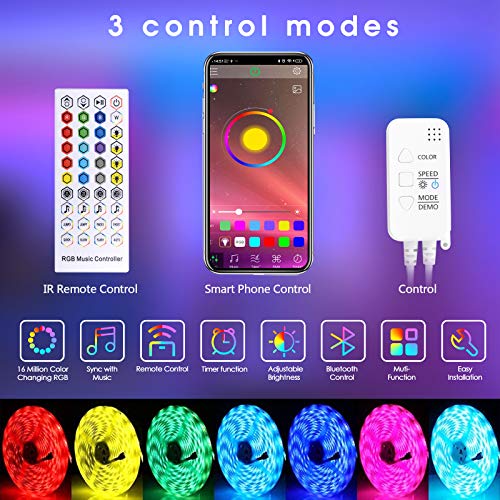 【App Control via Bluetooth】led strip lights can be complete control via three ways: control box, remote and phone app.With bluetooth Remote Control box,using cellphone and download “HappyLighting” app to control the light strip.Realize DIY editing 16 million colors, adjusting brightness,music function and timing function in remote distance only of if open the bluetooth.