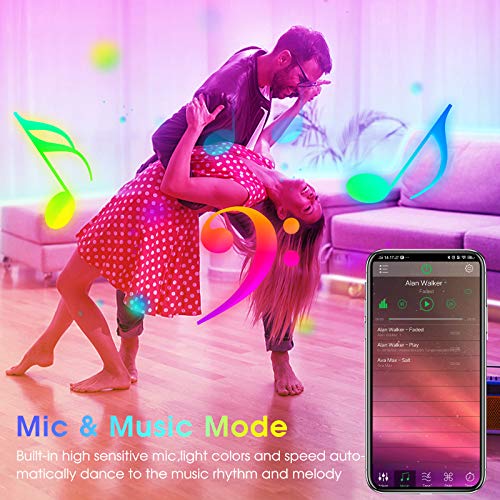 【Music Sync LED Strip Lights】With built-in high sensitive mic,after choose music mode by App or control,the lighting is sync with any rhythm music and dance the lights along with beats of music or hands claps,colors and speed automatically adjusting base on the rhythm and melody,for crazy party or exciting computer game playing,create your unique mood atmosphere.It is sync by the bluetooth signal,not afftecd by the voice of music,and you can adjust the music sensitivity.
