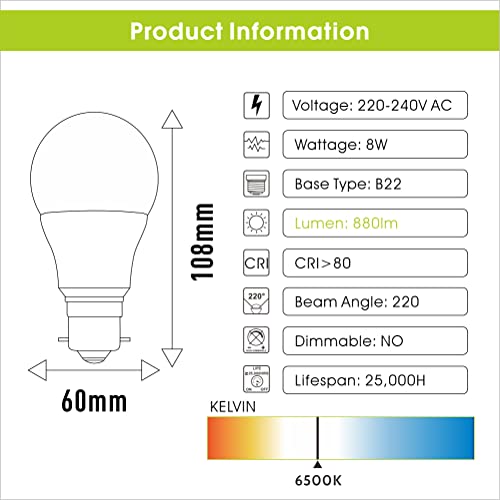 Specification: ROTTYI B22 Bayonet Light Bulbs 60W Equivalent, Cool White 6500K Daylight Bulbs, 8W 880LM LED Bulb, BC A60 GLS Energy…