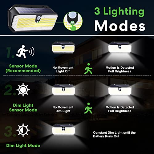 ✔🌞【3 Intelligent Modes】Mode ① (Sensor mode): solar security lights stay off until motion is detected and will light up with full brightness. (Recommended); Mode ② (Dim light sensor mode): Light up with dim light until motion is detected and will turn to full brightness; Mode ③ (Dim light mode): Constant with dim light all night until the battery runs out.