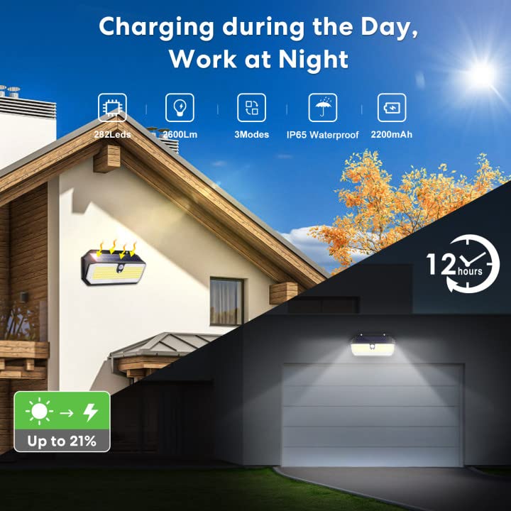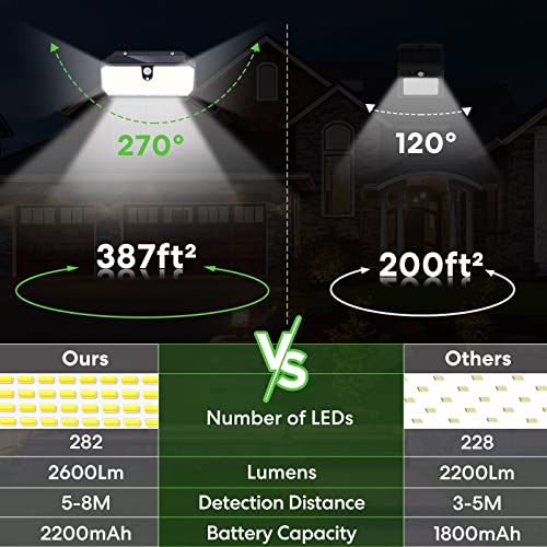 282 LED Solar Lights Outdoor, 【2 Pack&2600Lm】Solar Security Lights Outdoor Motion Sensor, 270°Wide-Angle Sensor Light…