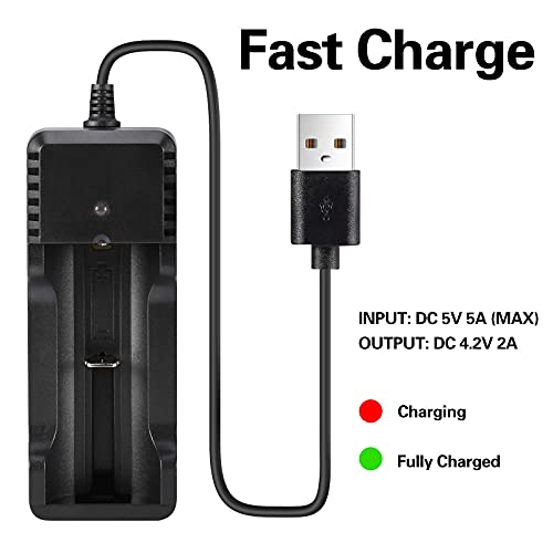 【SMART FAST CHARGING】The led torch rechargeable kit with 2A fast charging charger, suitable for common types of rechargeable batteries. Charge indication: red(in charging), green(full charging). The charger has a perfect over current, over voltage, over charging and short circuit full set of protection, so the short-circuit wiring will not damage the charger. SAFE, SMART, EASY AND FAST.