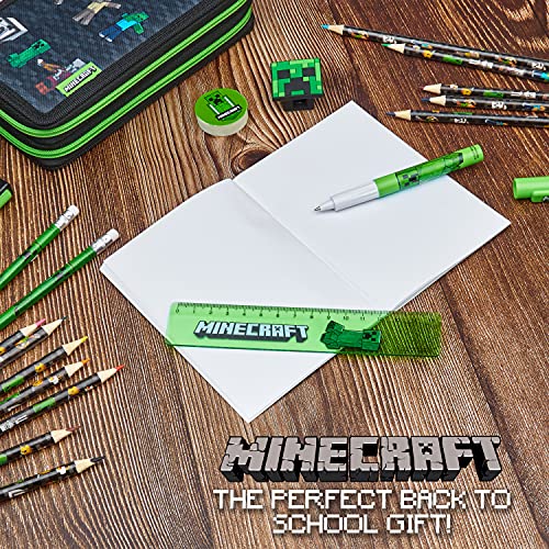 SCHOOL STATIONARY INCLUDED — Minecraft pencil case for boys is filled with 1 x mini notebook, 1 x rubber, 1 x pencil sharpener, 1 x 15 cm ruler, 2 x pens (black ink), 12 x colouring pencils, 2 x HB pencils.