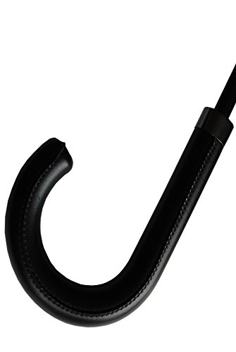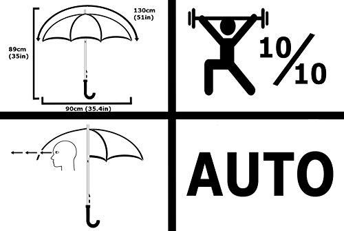 3) AUTOMATIC MECHANISM – This umbrella opens automatically so you can react to a downpour in seconds. When closed, the umbrella measures 89cm from tip to handle with a leather-look hook handle maximising comfort and style. It also has a subtle 1cm black trim around the base of the canopy. This trim is thinner when compared to many other umbrellas to assist with visibility at the important eye level.