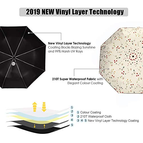 💦【Waterproof & Anti-UV Protection Umbrella】Cuby compact sun umbrella adopts NEW Vinyl Layer Technology, The 210T specially coated water repellent fabric and slip resistant rubberized handle make it outperform other compact umbrellas. Made with Korean ink prints and a fixed color layerThe color is more vivid,Prevent fading. Inner,Black rubber layer absorbs all shades of light, Under the umbrella, you can feel cool, Protect skin tissue, blocks 99% of harmful UV rays!