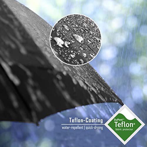 ✅ 𝗧𝗘𝗙𝗟𝗢𝗡-𝗖𝗢𝗔𝗧𝗜𝗡𝗚 – 𝗘𝗫𝗧𝗥𝗘𝗠𝗘𝗟𝗬 𝗪𝗔𝗧𝗘𝗥-𝗥𝗘𝗦𝗜𝗦𝗧𝗔𝗡𝗧, 𝗜𝗠𝗣𝗘𝗥𝗩𝗜𝗢𝗨𝗦 𝗔𝗡𝗗 𝗤𝗨𝗜𝗖𝗞-𝗗𝗥𝗬𝗜𝗡𝗚 – Whilst our competitors are content using 190T-grade fabrics, we manufacture our high-quality canopy using only 210T-grade materials with integrated Original DuPont Teflon-coating. This means rain simply runs off the canopy, and your umbrella is guaranteed to be waterproof, quick-drying and mould-resistant.