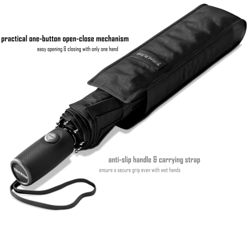 ✅ 𝗣𝗥𝗔𝗖𝗧𝗜𝗖𝗔𝗟 𝗦𝗜𝗡𝗚𝗟𝗘-𝗕𝗨𝗧𝗧𝗢𝗡 𝗢𝗣𝗘𝗡 𝗔𝗡𝗗 𝗖𝗟𝗢𝗦𝗘 𝗠𝗘𝗖𝗛𝗔𝗡𝗜𝗦𝗠 – Never be left out in the rain again: open and close your umbrella comfortably, quickly and reliably with just the press of a button. The rubberised anti-slip grip with hand strap ensures a firm grip even with wet hands, and allows you to hang, store and dry the umbrella no matter where you are.