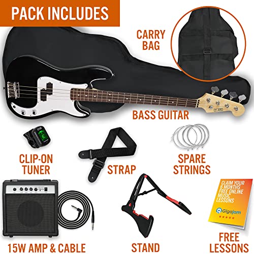 ULTIMATE STARTER BUNDLE – This bass guitar package gives you everything you need to start playing; a slimline 15w practice amp with 2 band EQ and headphone input for silent practice housed within a durable cabinet with corner protectors, carry bag for transportation and storage, clip on tuner for on-the-spot tuning, spare strings just in case, cable to connect to the amp, strap for playing standing up and stand for displaying.